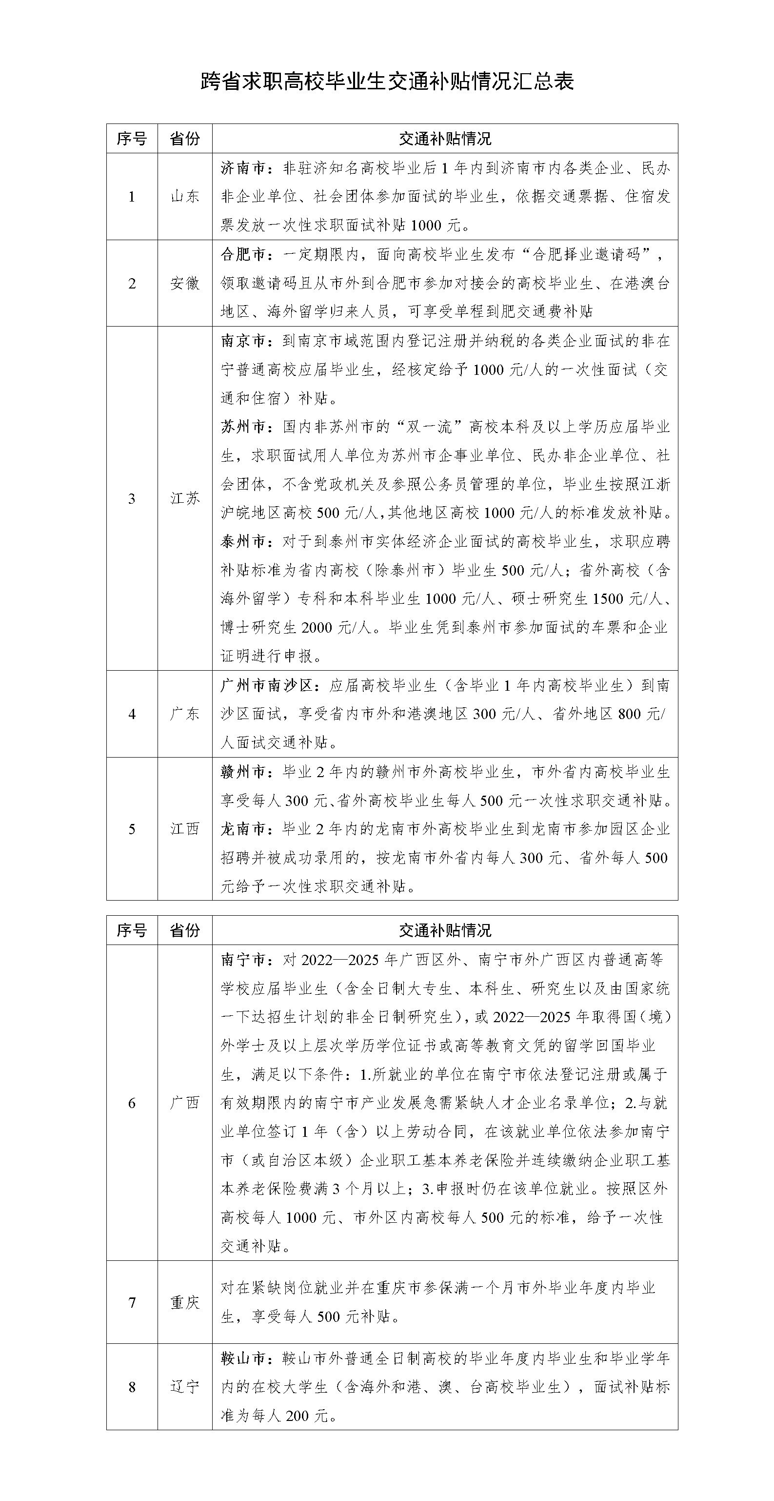 为进一步做好高校毕业生就业服务工作,为跨省求职毕业生提供便利服务,教育部学生司(就业司)整理形成了《跨省求职高校毕业生交通补贴情况汇总表》,请广大毕业生知晓用好相关优惠政策。